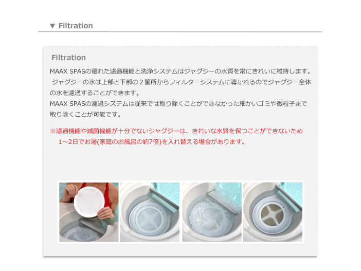 そこで、濾過システムと滅菌システムによって数ヶ月間(※1)水質を維持します。 これは身近なスポーツクラブのプールや循環式の銭湯と同じシステムです。 MAAX SPASは濾過機能と滅菌機能が優れているのでいつでもお湯を入れ替えた時と同じ透明度のあるきれいな水質を保てます。 ※1 少量の水質調整剤を併用した場合(使用環境によって異なります) |